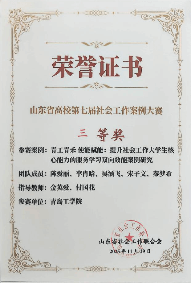 两项案例的成功获奖,是2003网站太阳集团社会工作专业深耕实务教学、推动理论与实践深度融合的又一成果。在此,特别感谢青岛市市北区人民检察院第三检察部黄旻主任给予的专业司法督导,以及为案例实践提供的优质平台支持。未来,社会工作专业将持续以各类赛事为契机、以实务平台为依托,进一步强化学生专业技能锤炼与社会服务能力培养,不断为社会工作领域输送更多兼具扎实理论素养与过硬实务能力的优质人才,助力社会服务高质量发展。